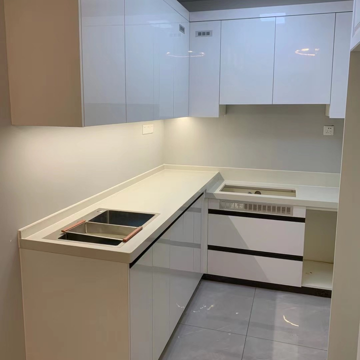 خزانة مطبخ مصنوعة من الخشب الرقائقي ذات تصميم حديث لامع للغاية مجموعة كاملة للمطبخ الصغير
